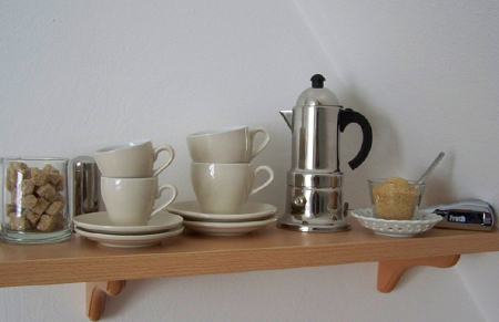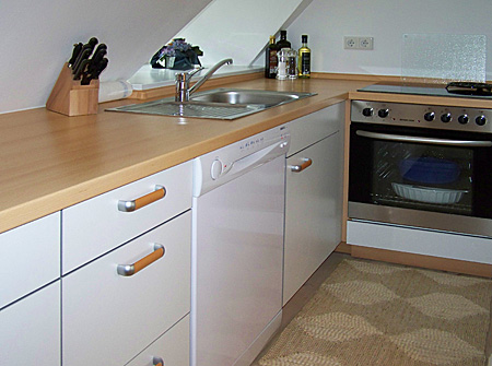 Den Wohn-/Essbereich statteten wir mit einer Küchenzeile wie folgt aus: E-Herd mit Cerankochfeld + Umluft-Backofen, großer Kühl-Gefrierschrank, Spülmaschine, Spüle, Kaffeemaschine, Wasserkocher, Ital. Espresso-Kocher, Aufschäumer, Mixer, Eierkocher, Backformen, Auflaufformen usw.