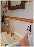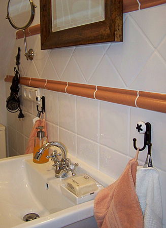 Das Duschbad ist mit einer bodentiefen Ganz-Glas-Duschwand, großem einstellbaren Duschkopf, Thermostat-Regler, ausgestattet. Ein Handtuch-Heizkörper sorgt für wohlige Wärme. Hänge-WC, eckiges Waschbecken mit Nostalgie-Armatur (Hot + Cold), alte Wandleuchte, alter Spiegel sind aufeinander abgestimmt. Fön + Kosmetikspiegel, Porzellan-Zahnbecher und zwei flauschige Bademäntel gehören selbstverständlich dazu.